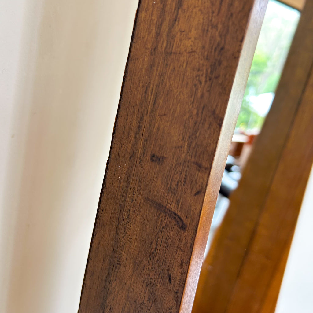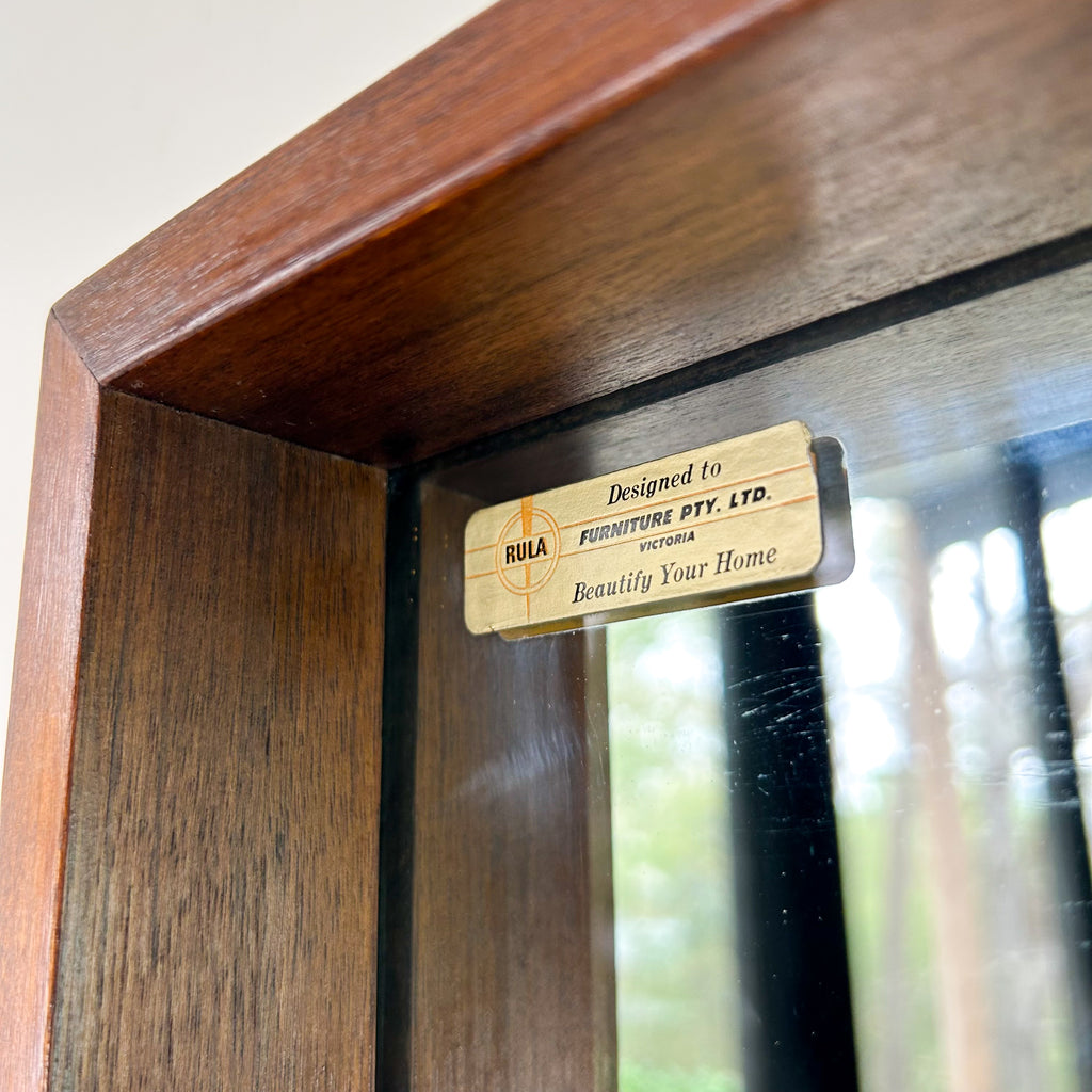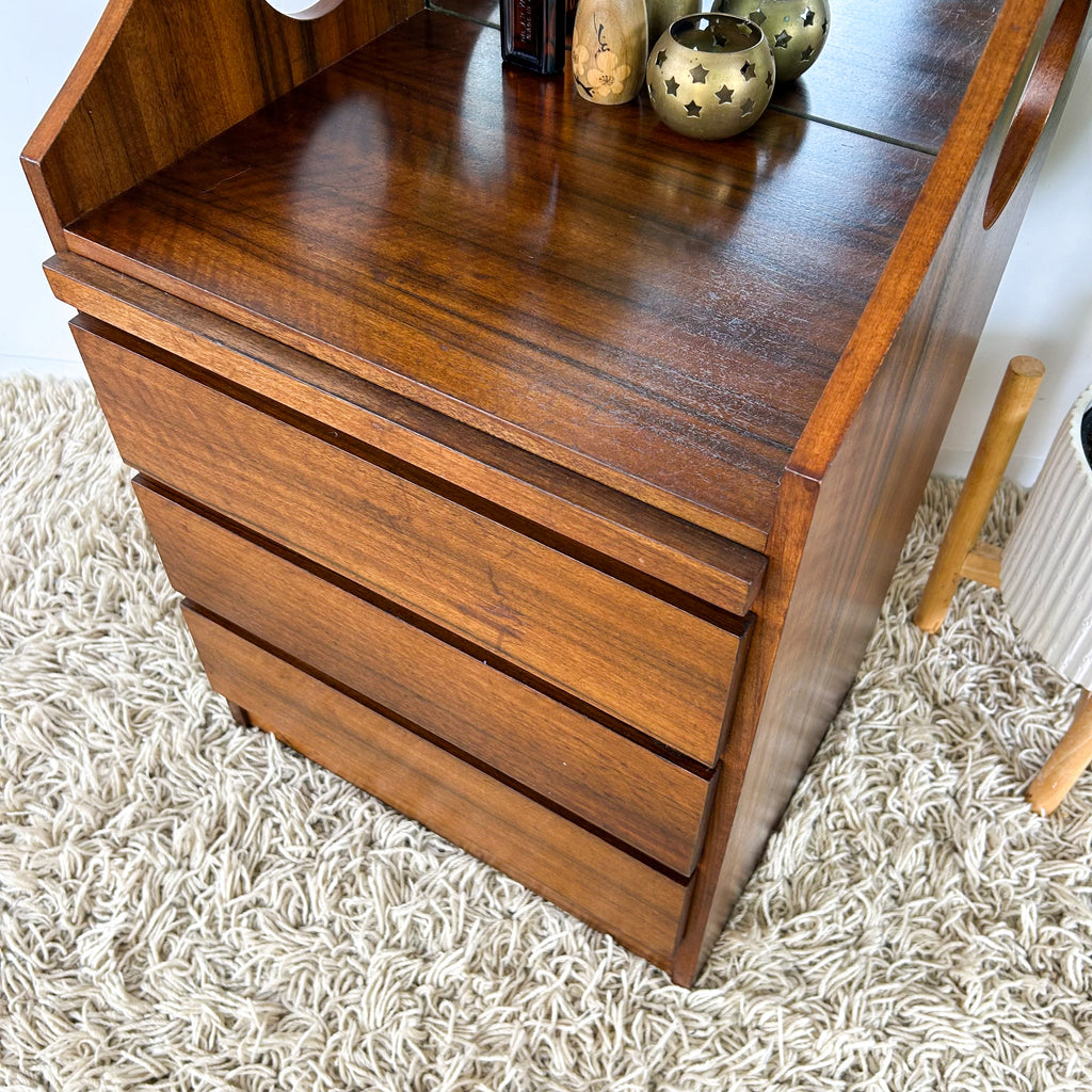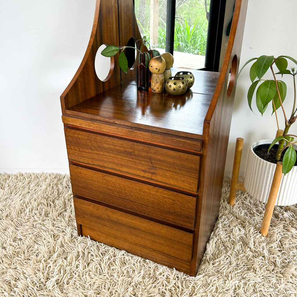 Tall vintage teak veneer dressing table with drawers & mirror, made in Melbourne by Rula Furniture. Consisting of pull-out shelf, three drawers with dovetail joins and tall, elegant mirror with round cut-outs on each side. It's a very nice piece, quality joinery and a great design.