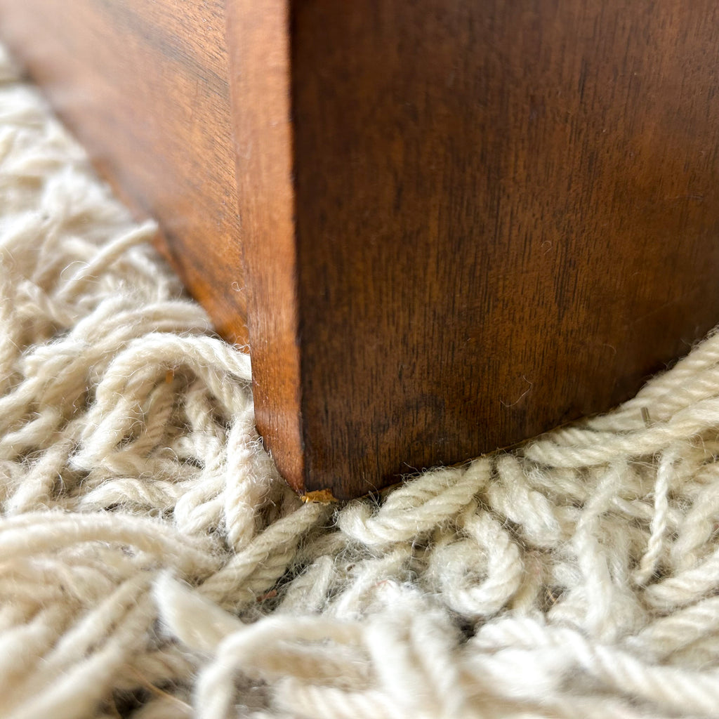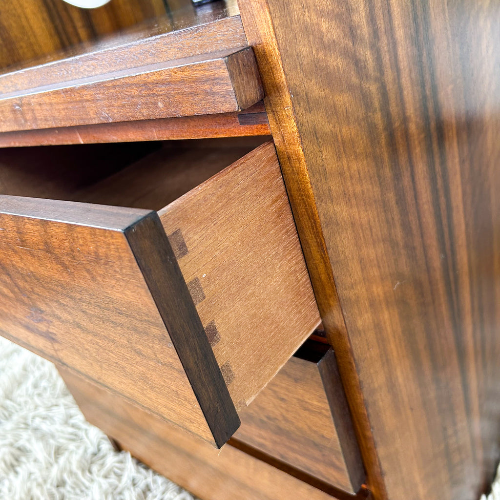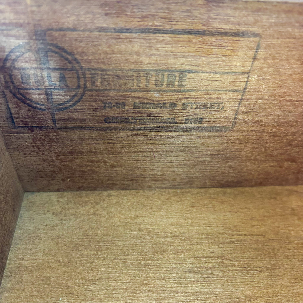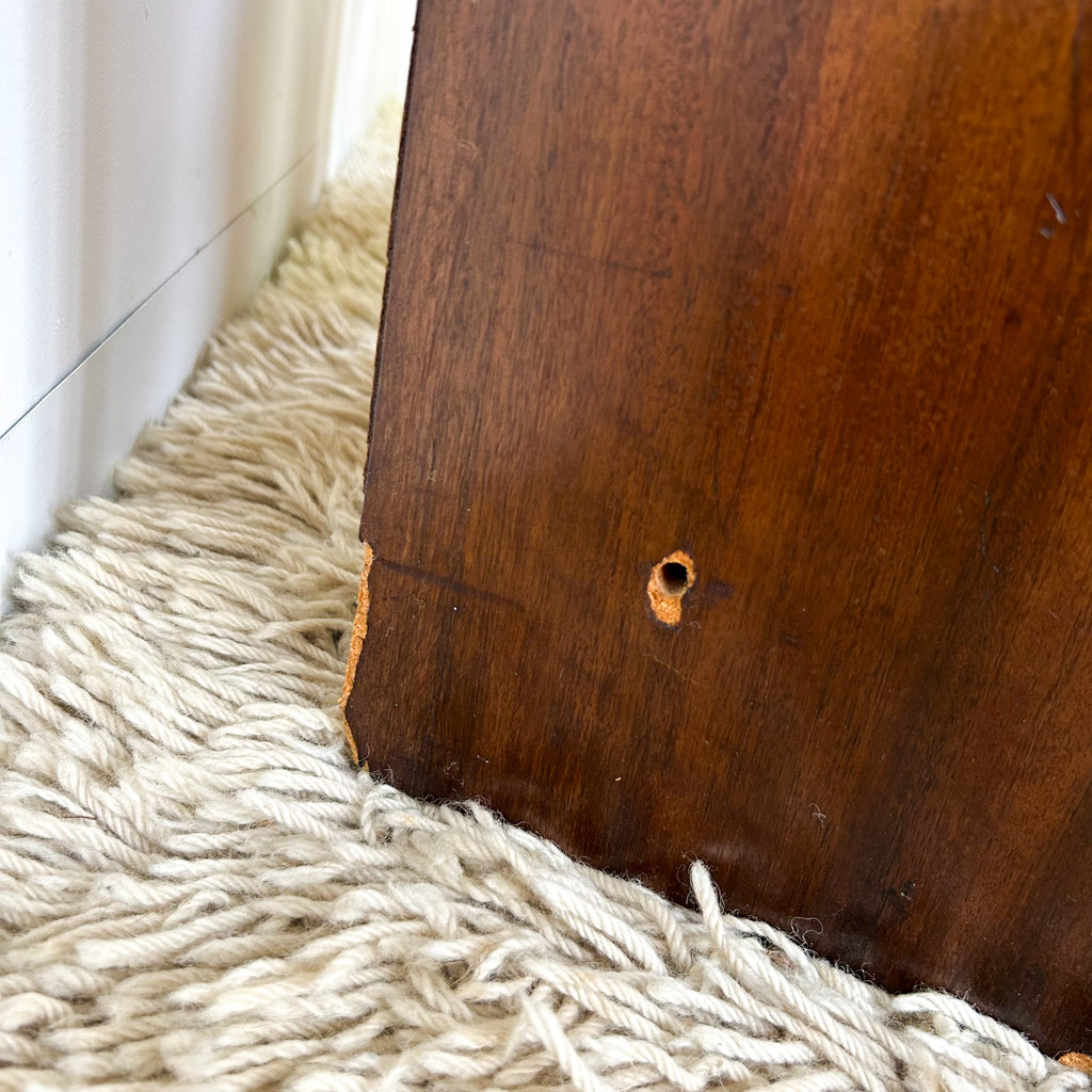 It's in good condition, but shows a some wear. The shelf has some marks and a little chip to the top surface. There's a few marks/scratches to the drawer fronts and tabletop. Some small chips to the veneer around the bottom on the sides. The left side panel also has two holes where this would have been previously attached to the rest of the bedroom suite. There's some scratches/marks down that left panel. REGARDLESS, this is a wonderful piece and it presents beautifully.