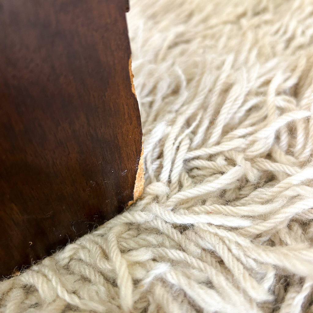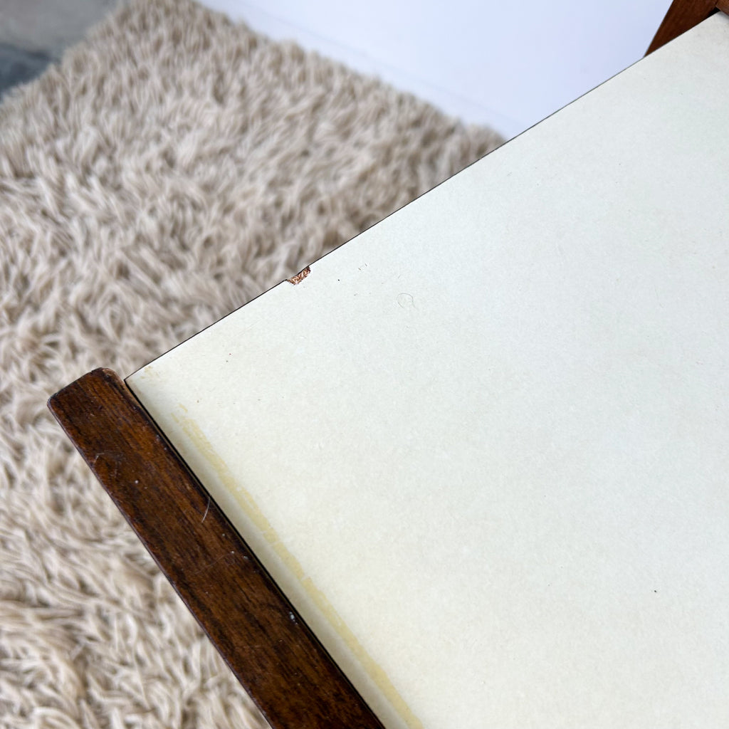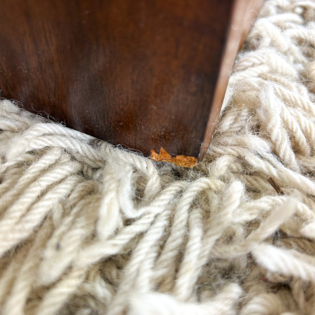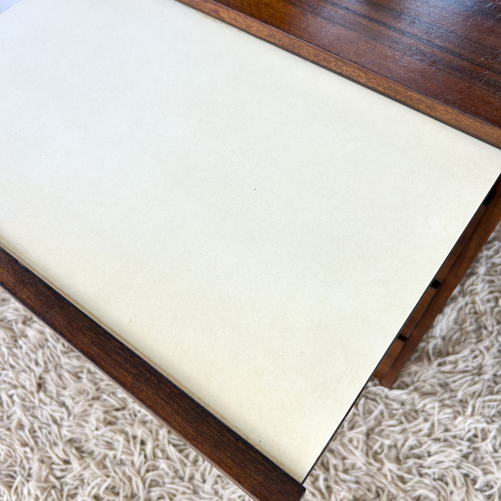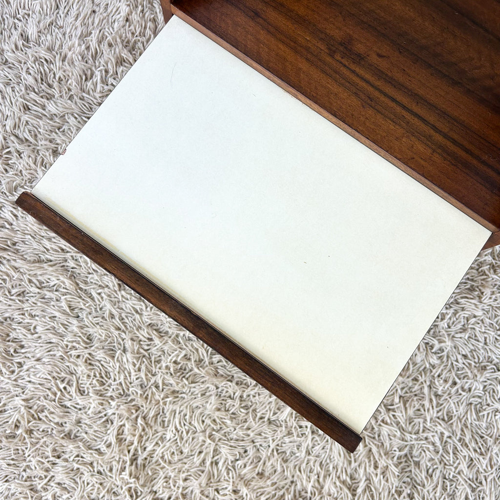 It's in good condition, but shows a some wear. The shelf has some marks and a little chip to the top surface. There's a few marks/scratches to the drawer fronts and tabletop. Some small chips to the veneer around the bottom on the sides. The left side panel also has two holes where this would have been previously attached to the rest of the bedroom suite. There's some scratches/marks down that left panel. REGARDLESS, this is a wonderful piece and it presents beautifully.