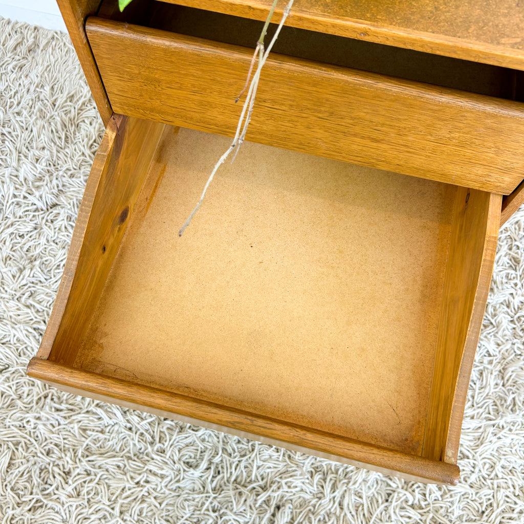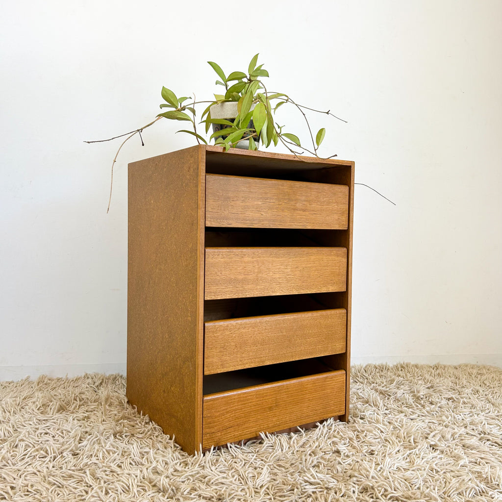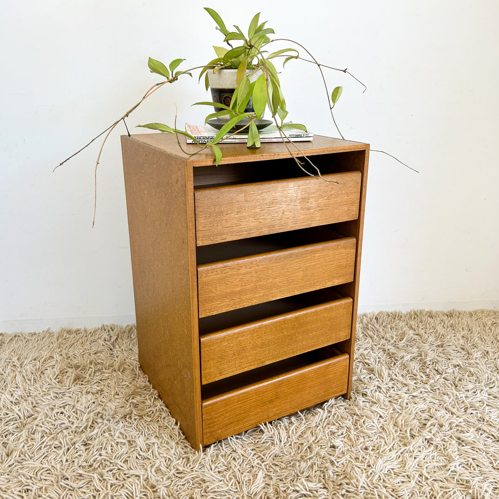 Vintage storage, great as a bedside table, but use anywhere really. Four drawers with dovetail joins. Exterior is sealed chipboard.