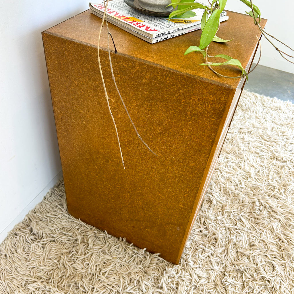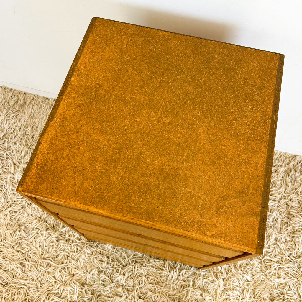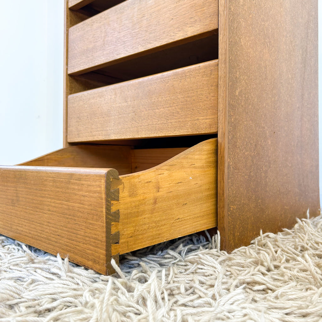 Vintage storage, great as a bedside table, but use anywhere really. Four drawers with dovetail joins. Exterior is sealed chipboard.