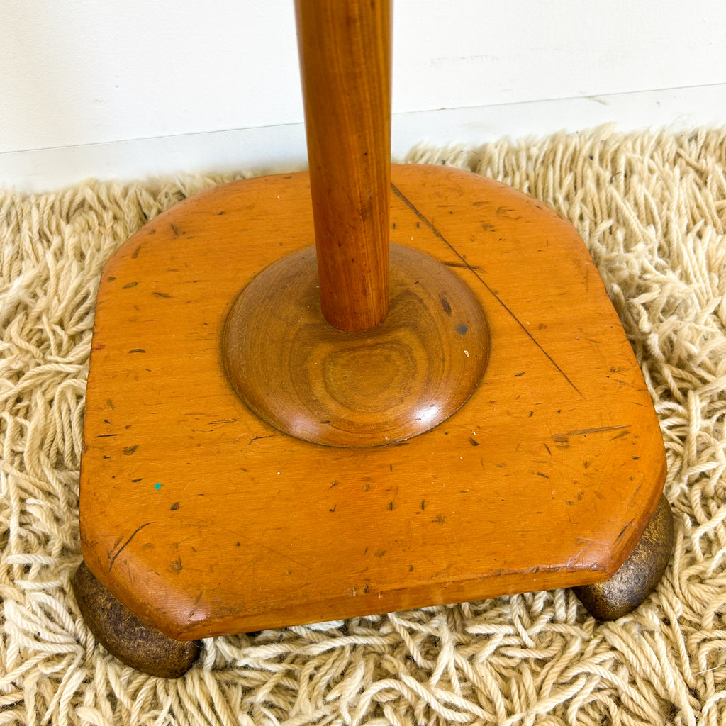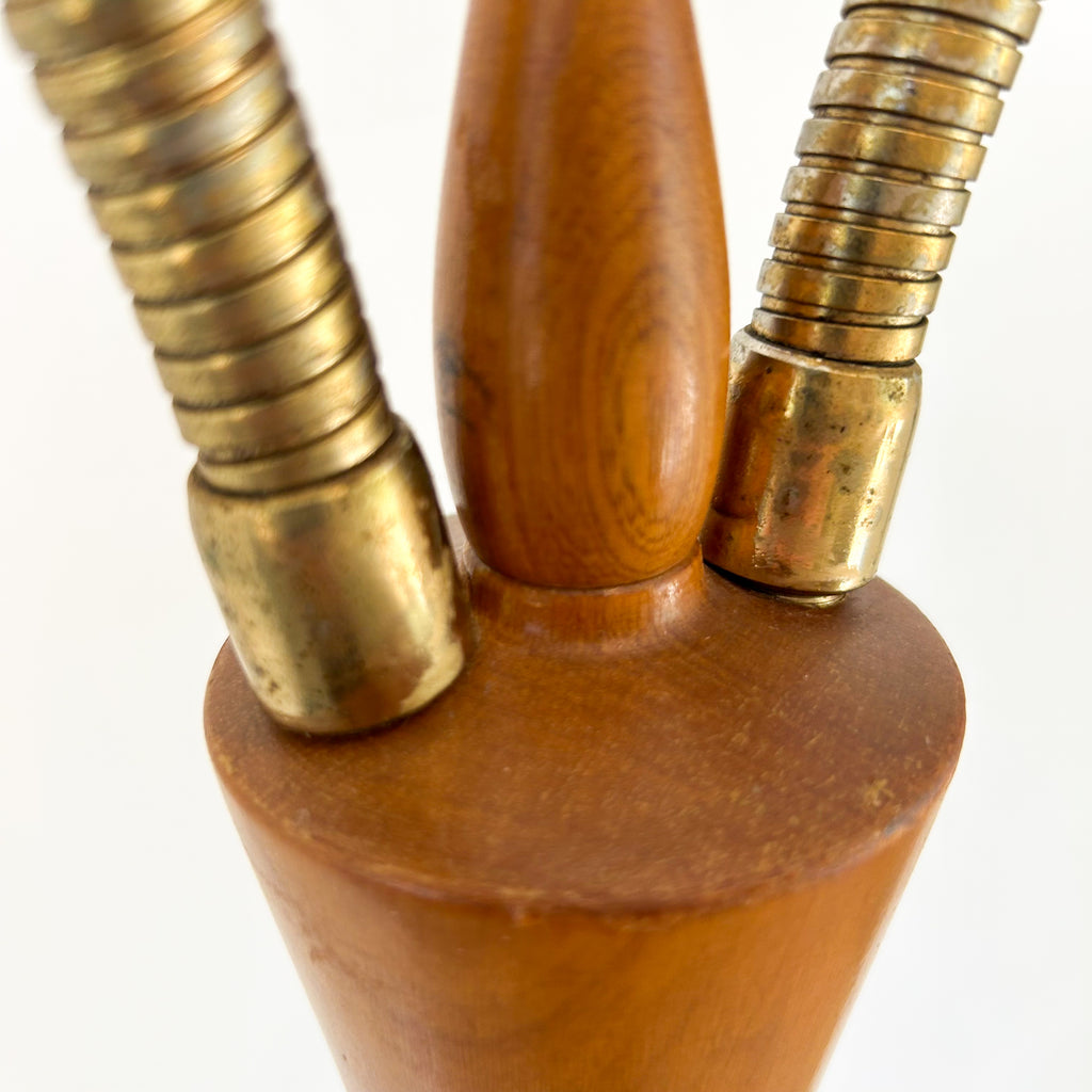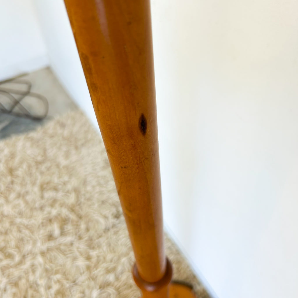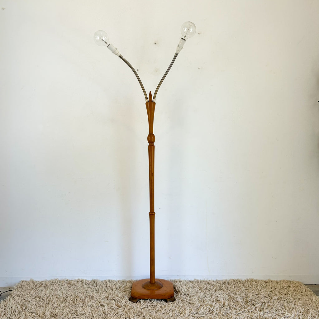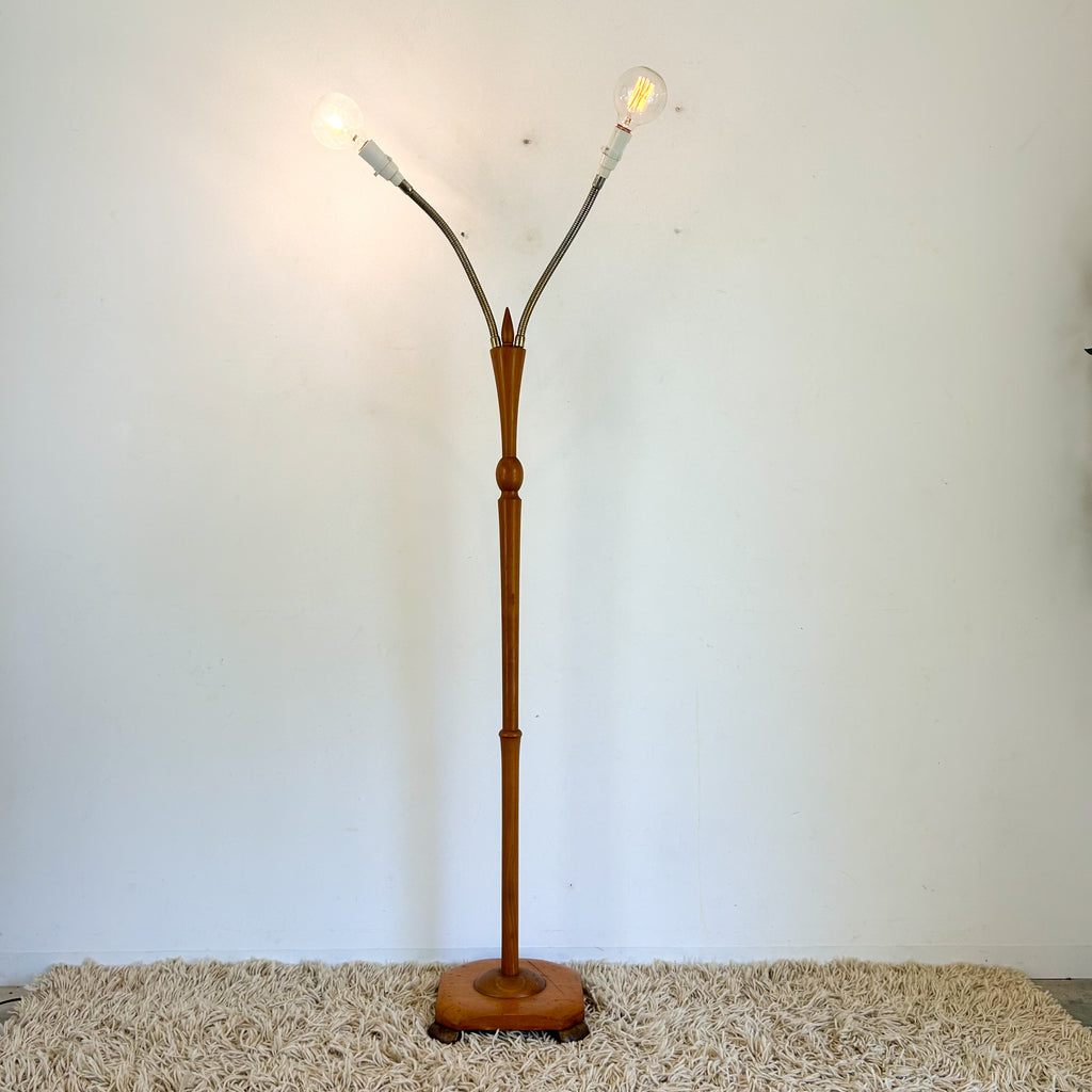 Mid century floor lamp. Beautiful turned timber shaft & base with metal feet and two gooseneck heads.